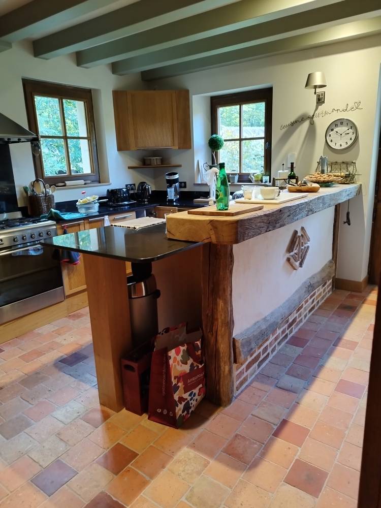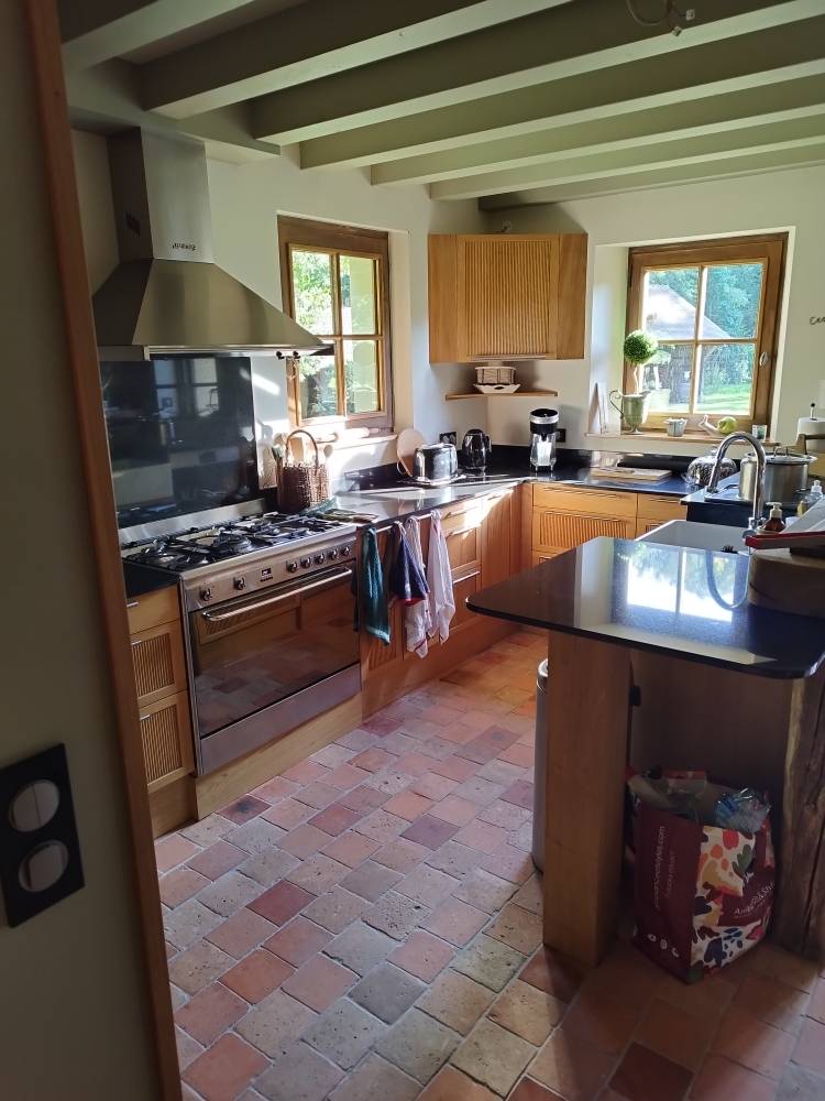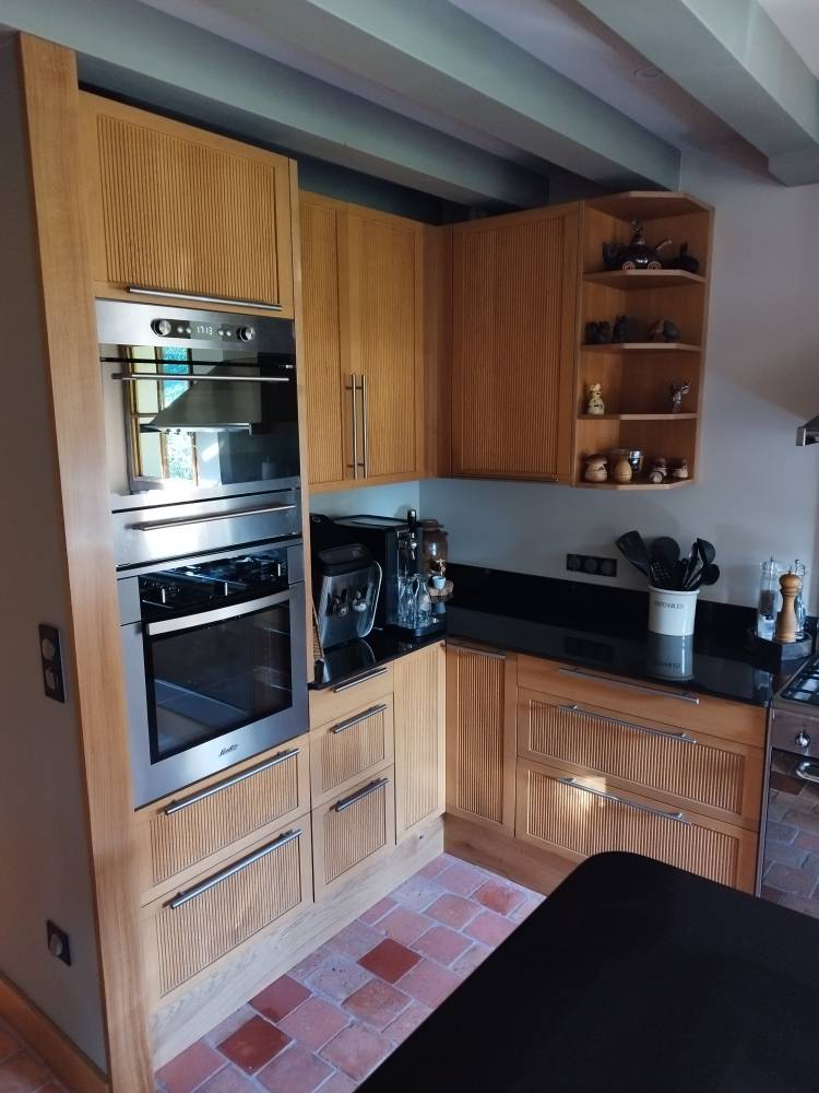 Fabrication et pose d’un ensemble de meubles de cuisine sur mesure, intégrant éléments bas, hauts, colonnes et îlot central, avec adaptation aux contraintes existantes (piano de cuisson, évier timbre d’office, électroménager).